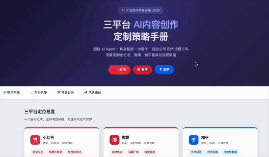 我想在小红书、微博、知乎上做AI自媒体账号,内容主要是围绕AI Agent、具身智能、AI硬件、硅谷公司等选题去做,分别针对三个平台的特征帮我定制一份内容创作策略指南。